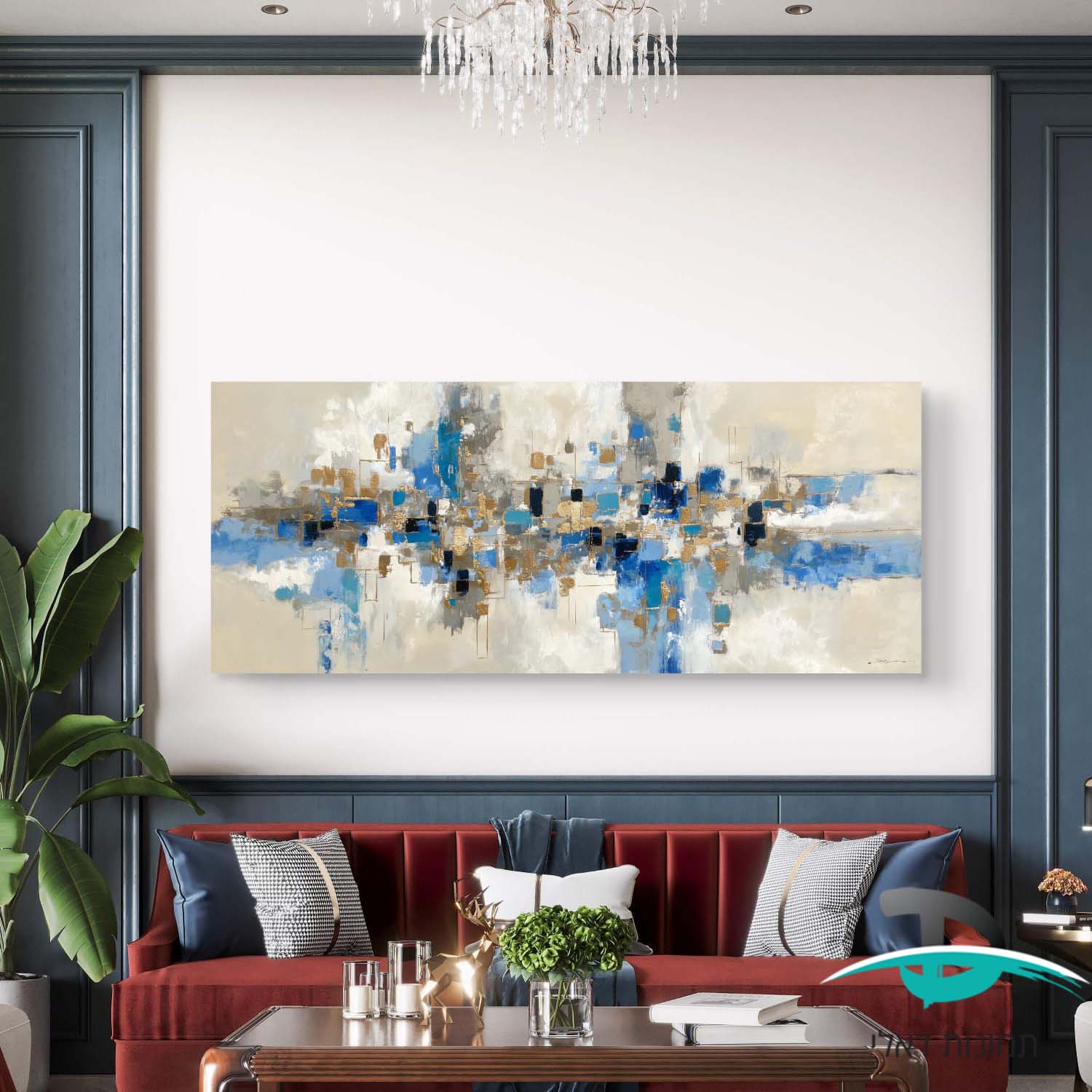 תמונה אבסטרקטית בסגנון ציור שמן כחול וזהב לסלון או למשרד דגם 4192