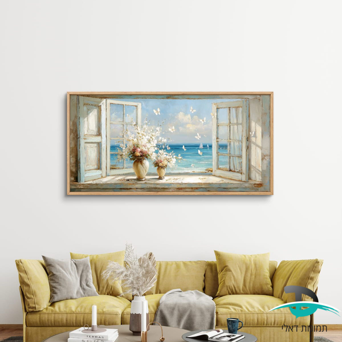 תמונה בסגנון ציור שמן, נוף לאוקיינוס ופרפרים לסלון או למשרד דגם 4187