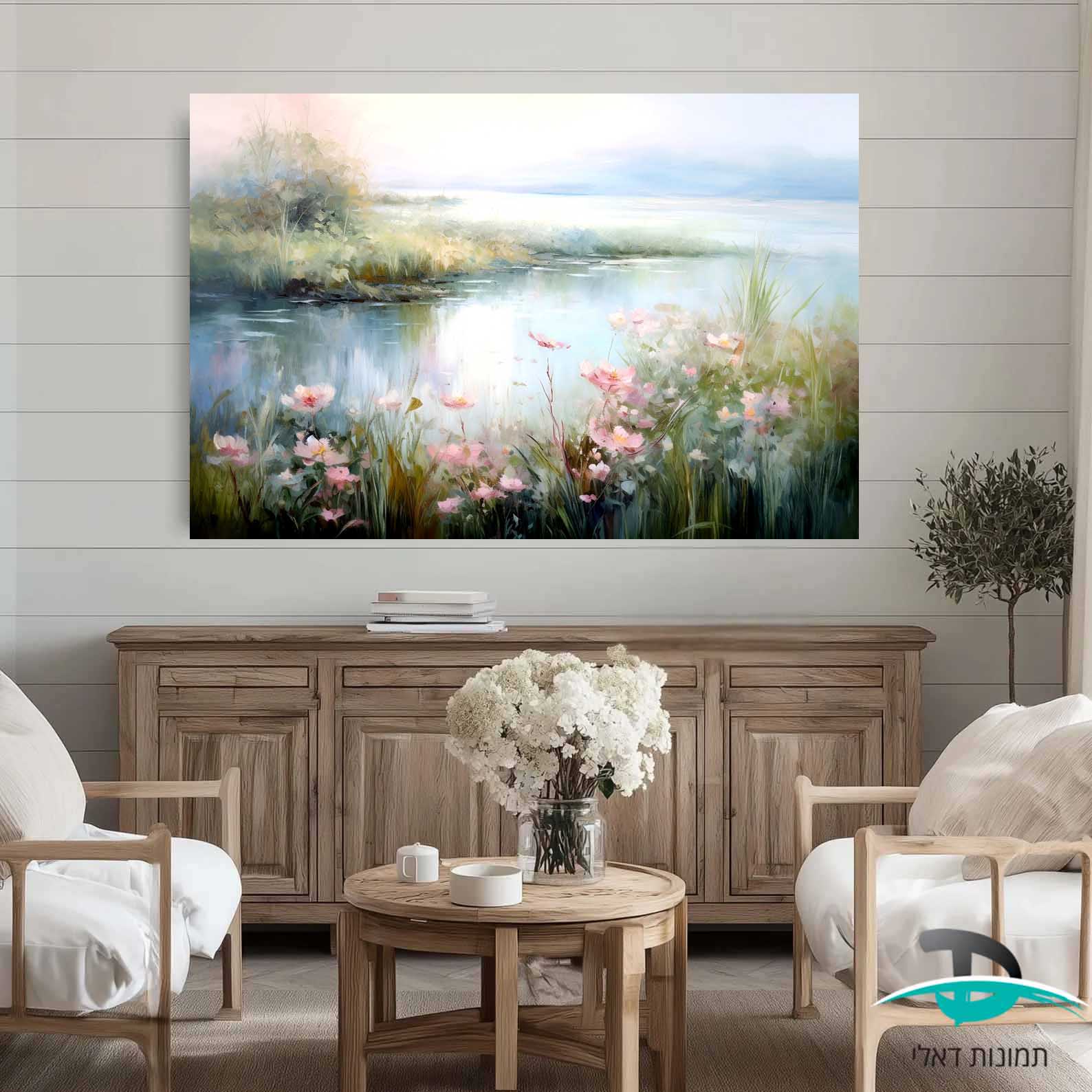 תמונה בסגנון ציור שמן של נהר ופרחים לסלון או למשרד דגם 4175
