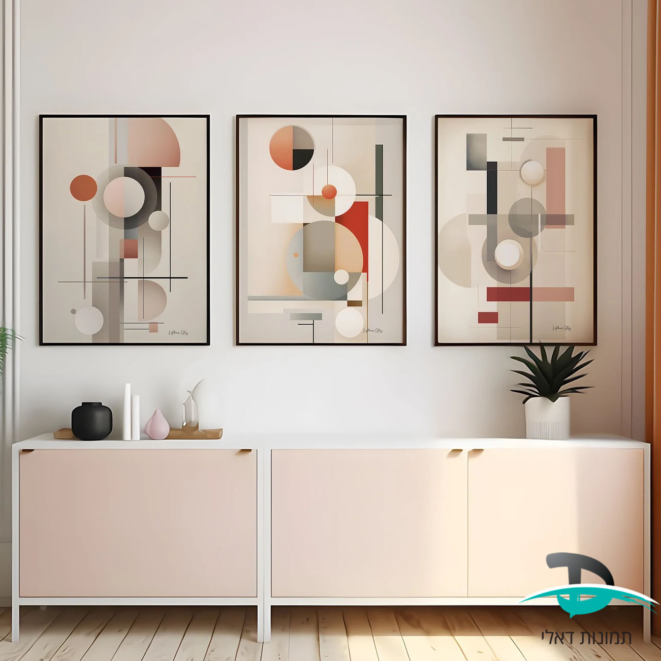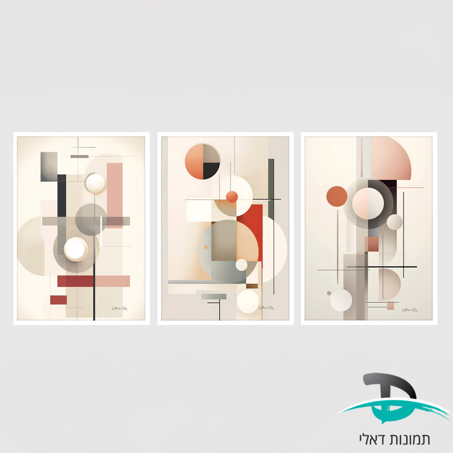 שלישיית תמונות בסגנון קונסטרוקטיביזם פסטל לסלון ולמשרד דגם 4110